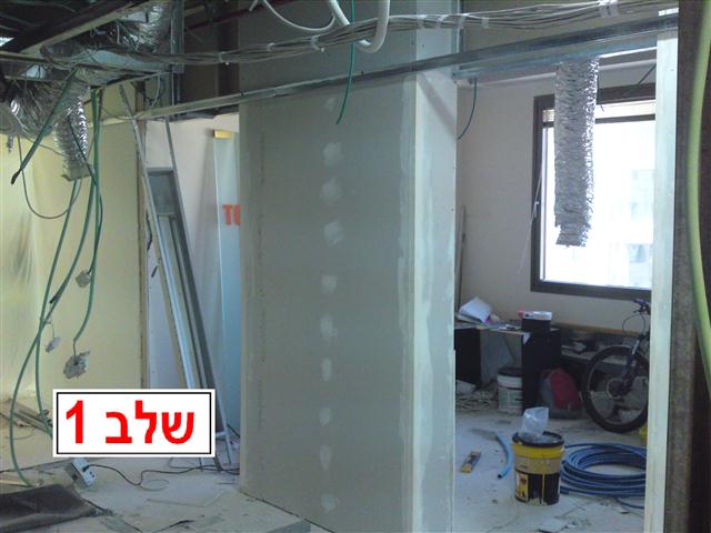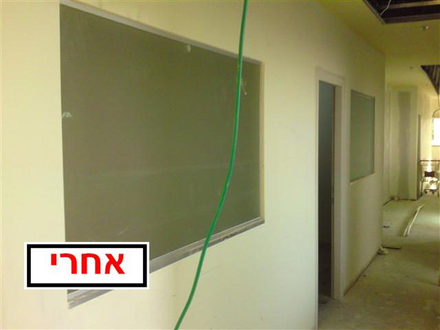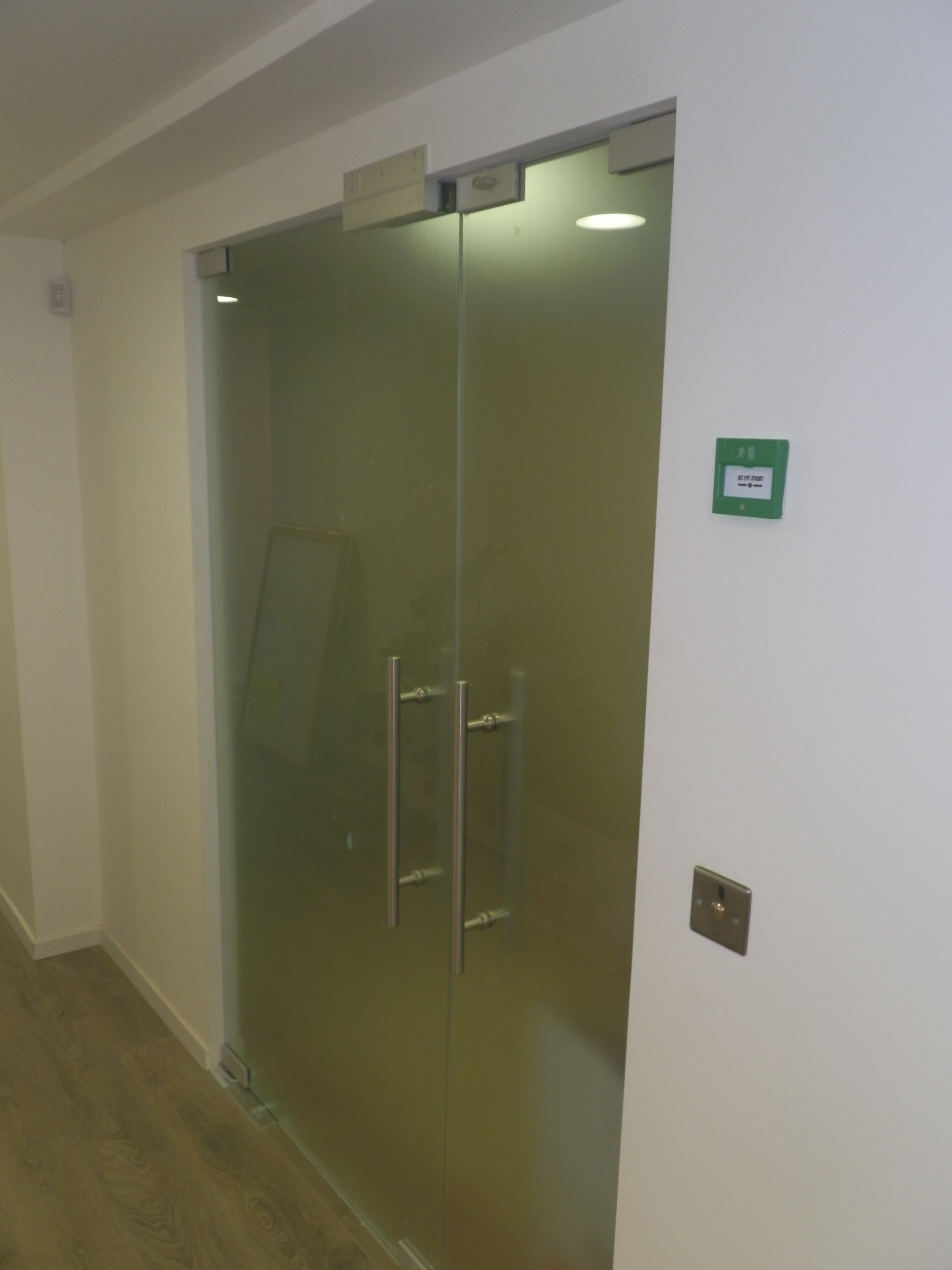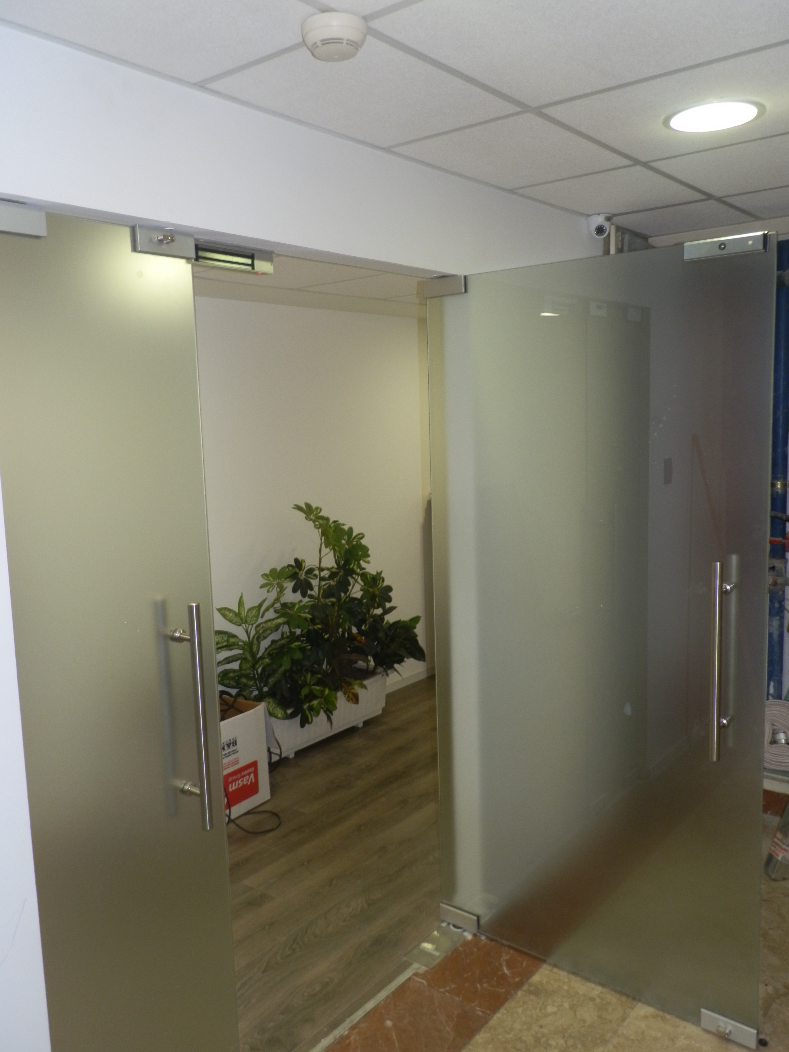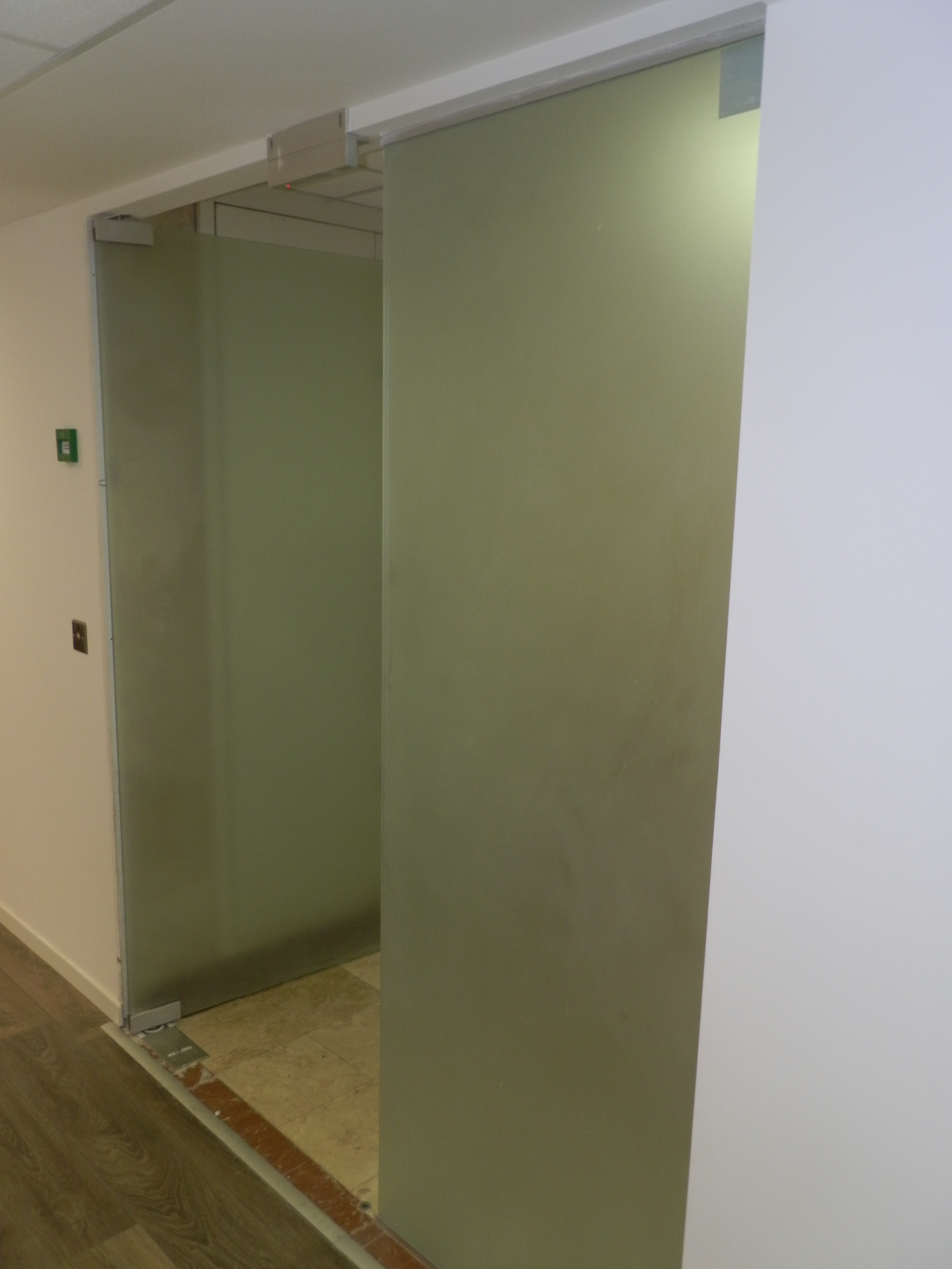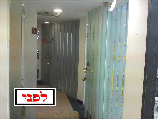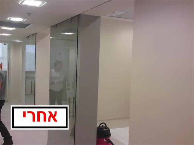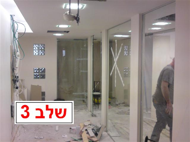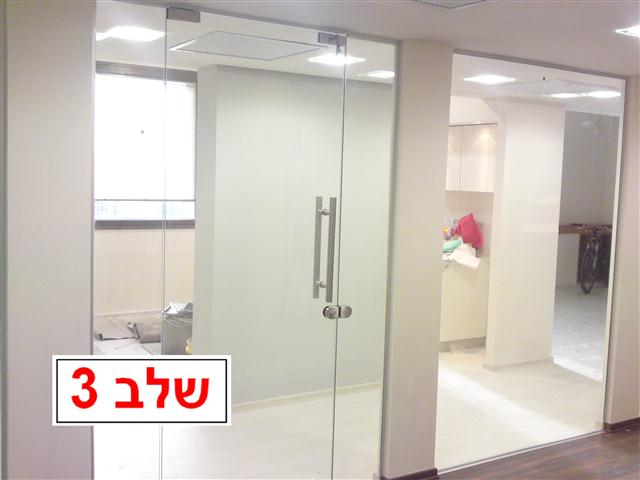 דוגמא למעקב אחרי עבודה של מחיצות זכוכית הכוללת דלתות הזזה מקבילות ודלת משאבה (מחזיר שמן).